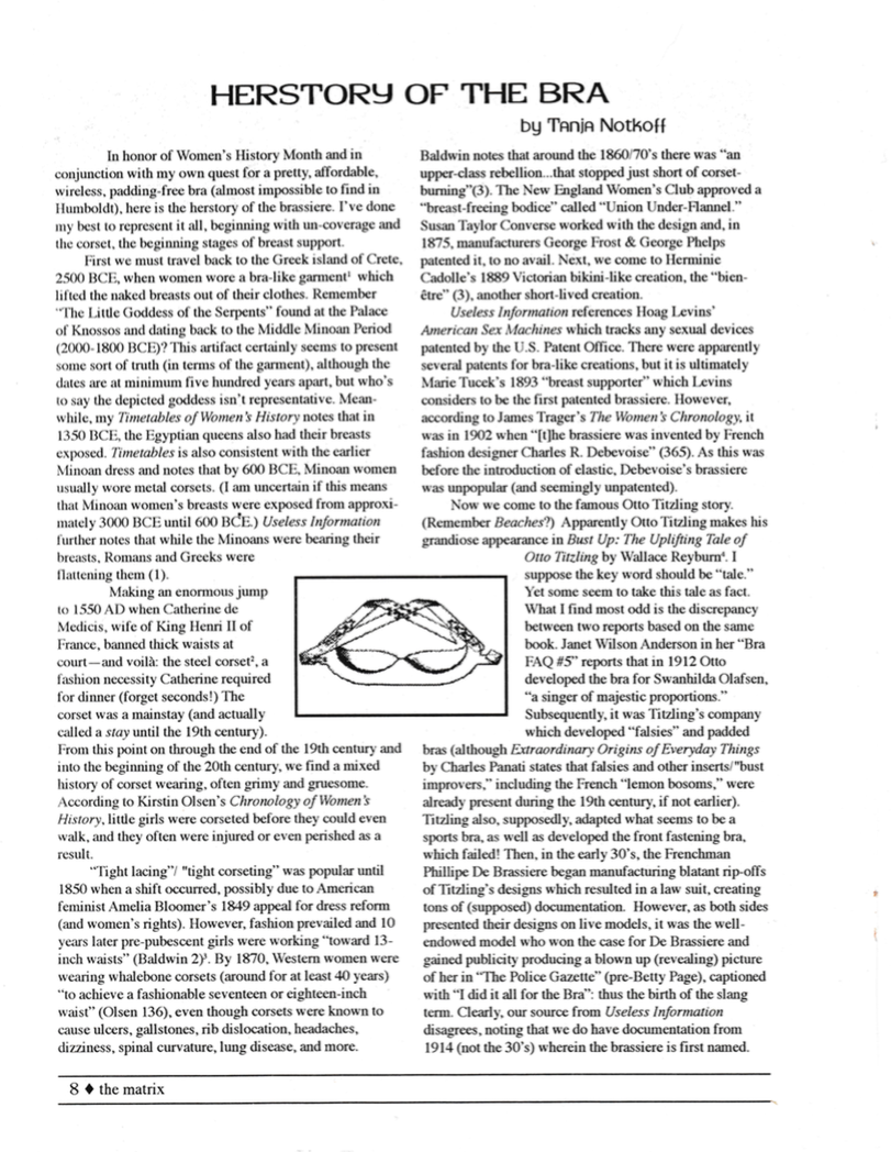The Matrix: The Humboldt State Women’s Center Publication, Issue 1, Arcata, CA, Spring 1998, “Herstory of the Bra” essay pgs 8-9 (as Tanja Notkoff), “Life, Death, and Love: (P)Rose of the Titanic” essay pgs 16-17 (as Tanja Notkoff)
